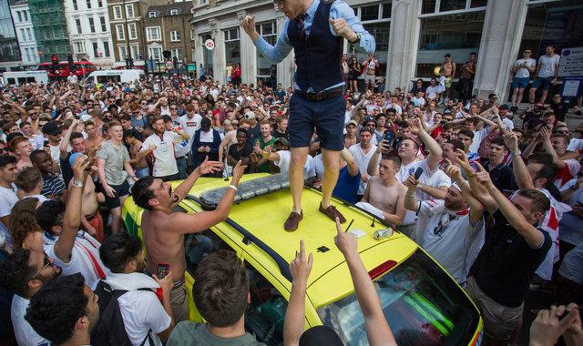 虽然比赛踢完时英国还是下午,但激情之下加上酒精上脑,庆祝的人们大白天就已经陷入了夜晚般的狂欢。聚众*行游**还是小事,有些人更是兴奋到爬上汽车开始蹦跶狂舞。然后一些画面就这样被抓拍了下来。比如下面这张,一位球迷跳到了一辆黄色的车上。