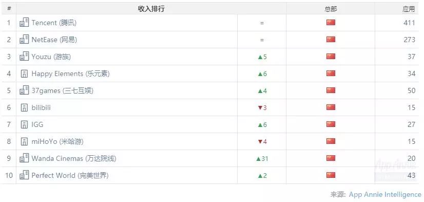 本月国内企业收入称得上是大变化,游族、乐元素、37手游、IGG、万达院线排名纷纷上升,特别是万达院线排名上升31位,万达院线游戏在2017年发布了多款产品,包括二次元向SLG产品《悬空城》、体育类《豪门足球风云》《中超风云》、与完美世界联合发行的《射雕英雄传手游》等等,而今,万达院线游戏正在准备2018年“万游引力”发布会,相信届时会带来更多产品信息。