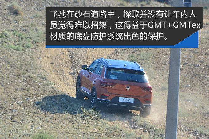 在原生态非铺装路面上行进,我们把驾驶模式调至越野选项,转向系统和油门响应变得稍微沉重一些,这时探歌真的就像官方宣称的“它是一部能跑拉力赛的SUV”一样,甚至能够用“如鱼得水”的来形容它的表现,而且韧性十足的悬架系统,很好的过滤了路面上的坑洼,减少了坑洼对于车辆的冲击,致使车内人员没有出现过大的颠簸,仿佛处于铺装道路上。