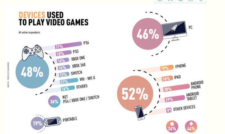 根据GameTrack的一份玩家问卷调查结果显示,52%的意大利玩家称曾使用智能手机玩游戏,安卓设备的使用率远高于iPhone和iPad;曾使用PC和主机玩游戏的意大利玩家占比分别为46%和48%。在家用主机当中,最受意大利玩家欢迎的是PS4,约31%玩家使用PS4玩游戏。