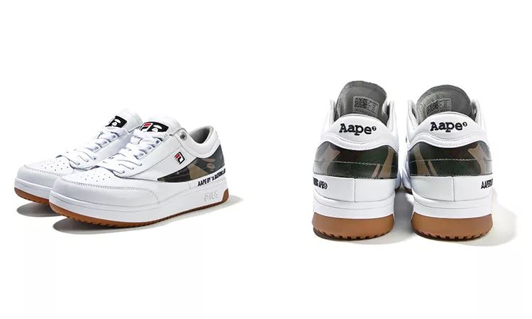 而此次联名的设计方面,最大化的彰显了两个品牌的特点特性,用AAPE象征性的迷彩融合FILA 运动元素,运用黑色当作核心,加入了双方的Logo,背后则搭配了硕大型的FILA品牌字样。