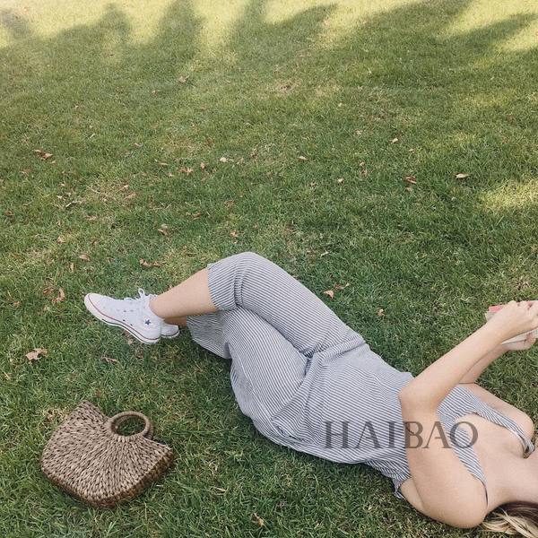 吊带连体裤也是衣橱常备,竖条纹的款式最显瘦,碎花的款式也很合适夏天。