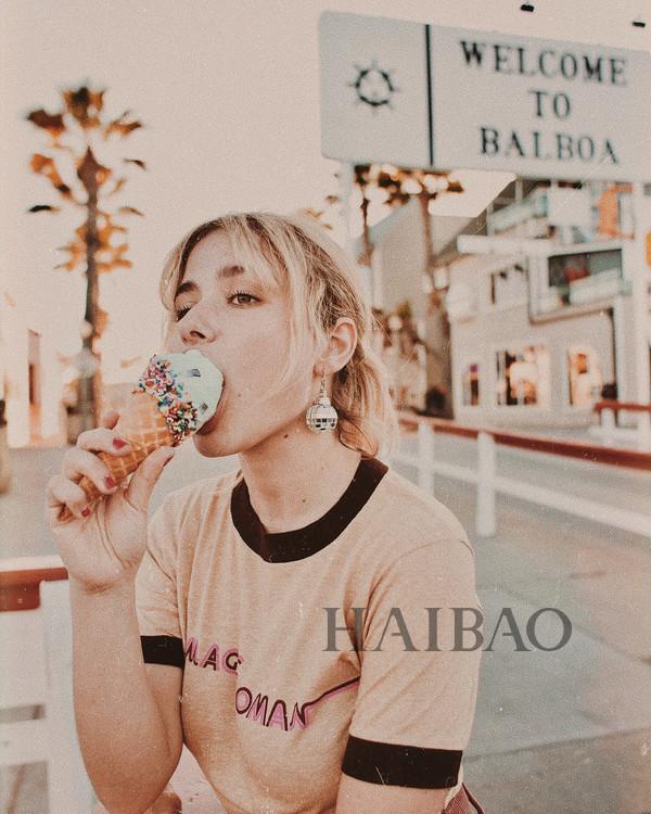 夏天衣橱里必不可少的就是T恤了,简简单单的搭配就能打造夏日甜心女孩。Slogan Tee是每年必Buy,淡淡浅粉色搭配Disco风格的夸大耳饰,街头小女生的风格。虽然不是传统意义上的“瘦子”,但是Morgan也不拒绝冰激凌这种高热量甜品,毕竟夏天就是冰激凌的季节呀。