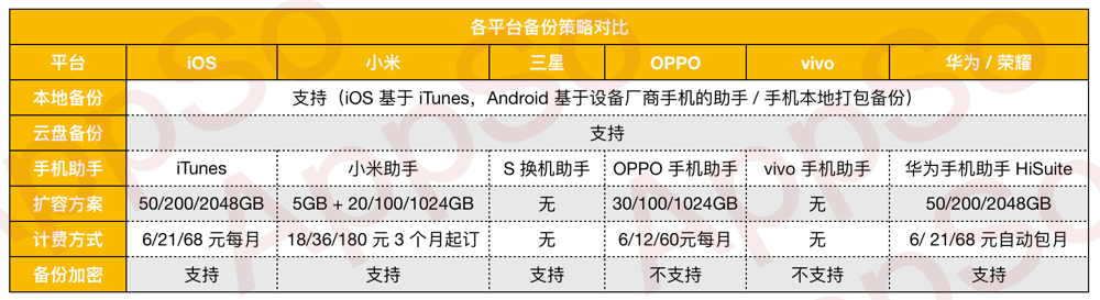 不过由于厂商不同,所以手机备份的方法和服务都各有存异。因此,我们做了一个整理表格,各家厂商的备份方式和扩容收费能够参考下表: