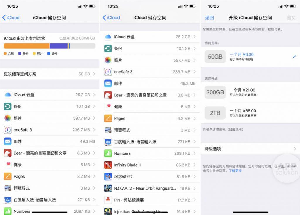 在「升级方案」里,苹果提供了 5/50/200GB、2TB 四种方案可选,费用从 6 元到 68 元不等。