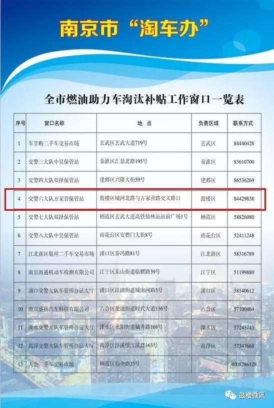 淘汰补贴工作由市淘车办牵头,参照淘汰黄标车补贴方式,各区在本行政辖区内设立淘汰补贴工作窗口发放补贴(全市范围设立13处窗口,主城六区各1处、新五区及江北新区各1处、市公安局交通管理局车辆管理所1处)。鼓楼区淘汰补贴工作窗口在交警六大队方家营保管站(鼓楼区城河北路与方家营路交叉路口)。