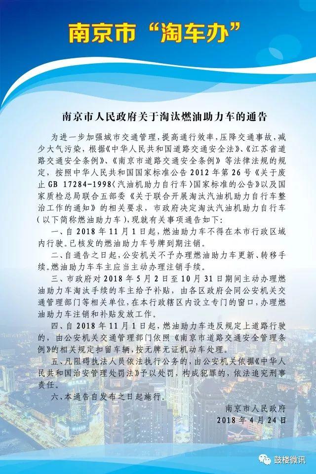经市政府批准,鼓楼区根据《南京市人民政府关于淘汰燃油助力车的通告》,决定自2018年5月2日起至10月31日止,对市公安机关交通管理部门核发牌证的燃油助力车开展淘汰工作。