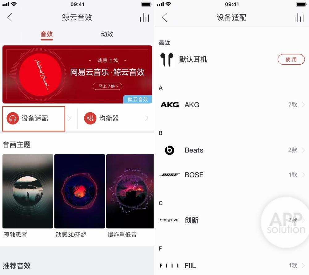 开启「鲸云音效」后,先「设备适配」。网易云音乐为了更好地适配用户的耳机,也针对 Beats、Bose、Sony 等品牌设备推出了 50 多款设备音效。用户能够在「设备适配」里找到自己的耳机型号,使用「专属」的音效。如果没有适配耳机的话,那么直接选择使用「默认耳机」体验非专属的音效就好了。