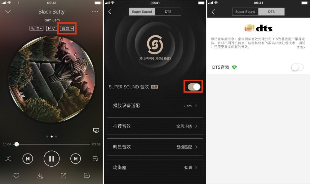 其实,另一款主流的音乐*放播**器也早就有了类似的功能。在 QQ 音乐里,用户能够直接点击*放播**界面的「音效」进入设置页面选择自己喜欢的音效。其中,Super Sound 为免费音效,而 DTS 音效为绿钻用户专享。