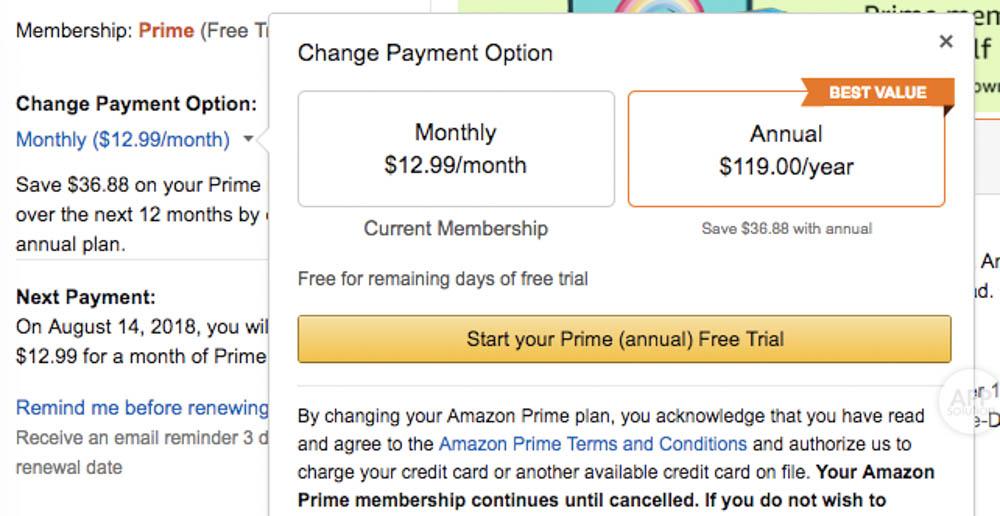 好在亚马逊还是很厚道的,并不会在取消这件事上难为人。依次点击「Account & Lists」、「Prime」,进入会员计划管理页,在这里你也能够改变付费计划,默认是按月付费(12.99 美元),直接付一年是 119 美元,价格会更划算。