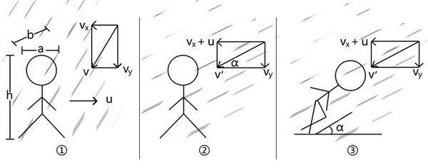 如此一来,人应该以怎样的角度跑就显而易见了:在人参考系内,尽量让自己的身体和雨下落方向保持平行就能够了(如图3)。
