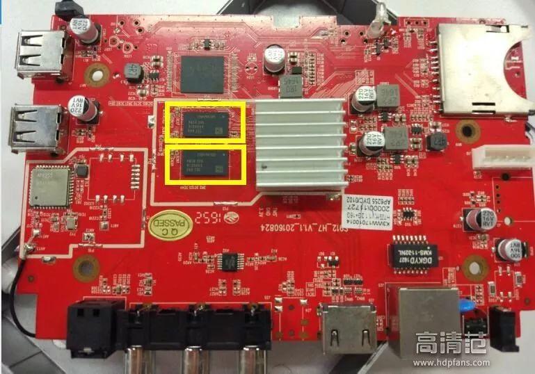 b.拿到主板之后,就能够看到内存颗粒了,例如笔者现在拆开的这款海美迪H7,就一共配置了4颗内存颗粒(主板正反面各2颗)。