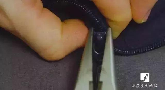 金属的拉链用久之后,拉头便会松动,口径随之变大,就不好拉上了。用镊子夹住拉头的尾部,将其夹紧,不要太用力,夹断了就不好了。