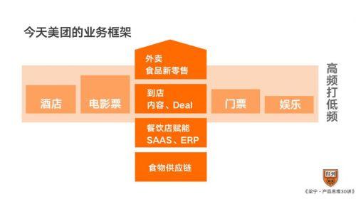 外卖作为头部是极其高频的,美团最极致的用户一个月会点二十几次外卖。有这样高频的业务带动,就能够形成流量分发,分发到电影票、酒店、门票、娱乐这些领域。