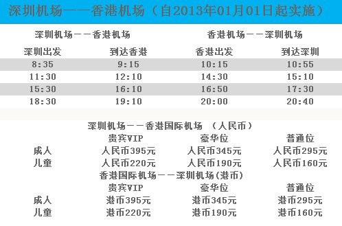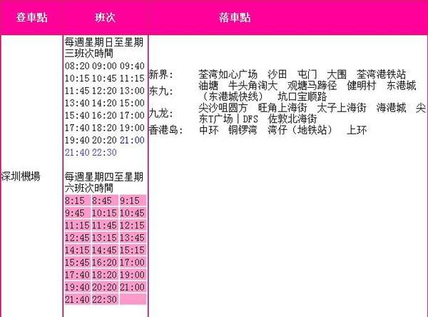 ①深圳机场——香港巴士时刻表(全程75分钟,票价150港币)。