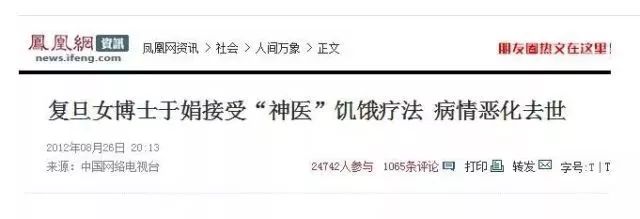 2012年,曾因写下8万字抗癌日记而火爆网络的复旦大学博士于娟,在生命的最后阶段,被所谓的“神医”忽悠,放弃了医学上惯用的治疗癌症三种手法,选择了民间“神医”的饥饿疗法,最后病情不断恶化,不治身亡。