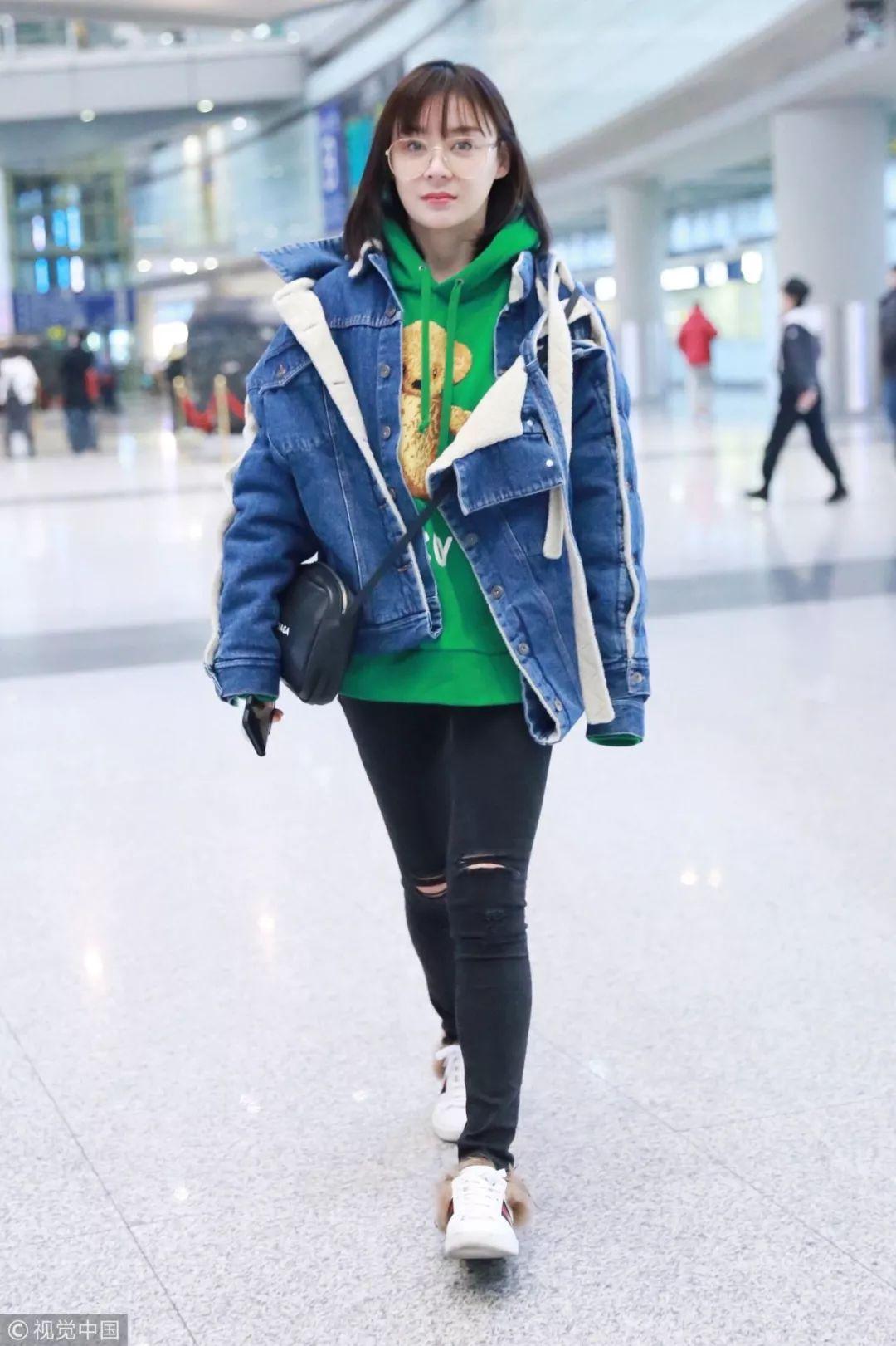 袁姗姗的假两件羊羔毛牛仔夹克内搭绿色卡通图案小熊印花连帽卫衣,加上齐刘海和眼镜,童趣少女味全了!