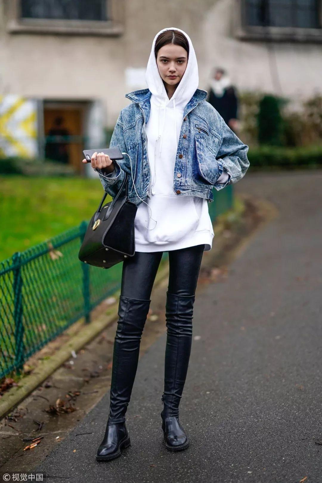 乍暖还寒时,牛仔布拼接机车夹克+内搭白色帽衫,下搭深蓝色紧身牛仔裤,张碧晨用两件创造四件叠穿视觉效果。