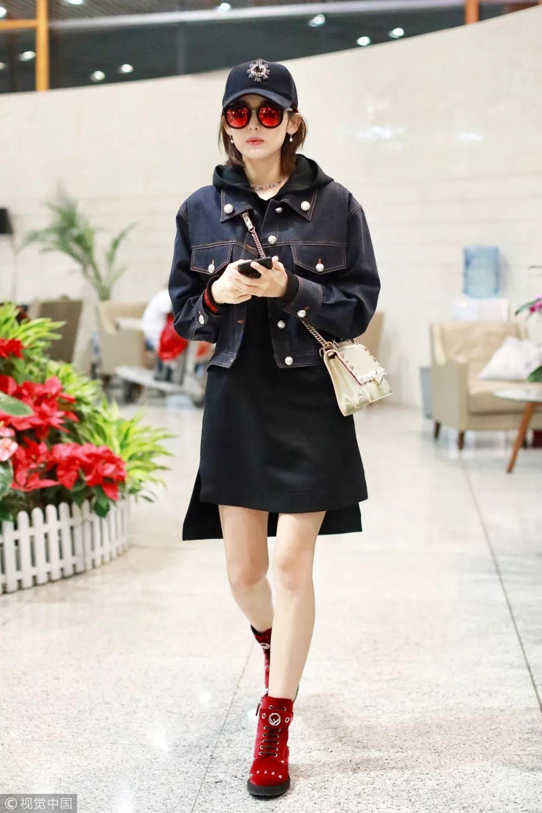娜扎的深色牛仔夹克内搭黑色前短后长连帽卫衣裙,一色系的连体感不仅清爽还兼顾时髦度。