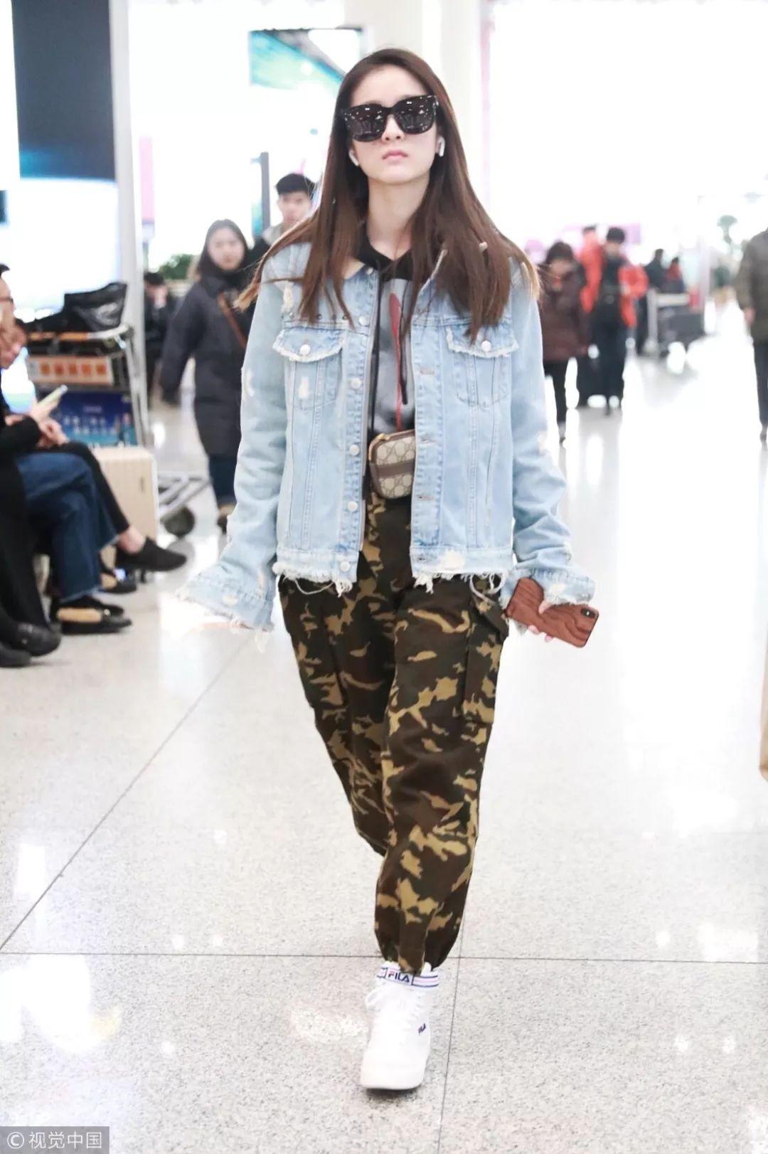 最近人气急升的张雪迎用黑色人像印花帽衫搭配水洗蓝做旧毛边牛仔夹克,腰上挂着爆款Gucci腰包,而下搭的则是迷彩印花宽松工装裤,一向文静可人的雪迎妹子也走潮人路线了。