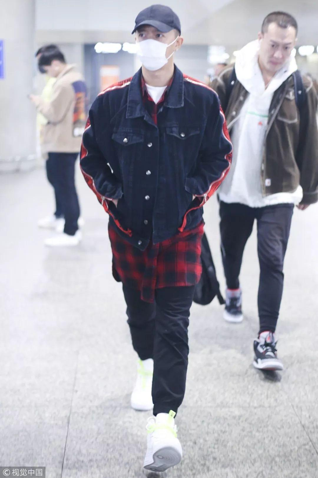吴亦凡用牛仔夹克内搭红色格纹衬衣和supreme红色logo黑色T恤,下穿黑色牛仔裤,脚踩Nike x Off White黑色球鞋。配上这发型,永远走在潮流的最尖端。