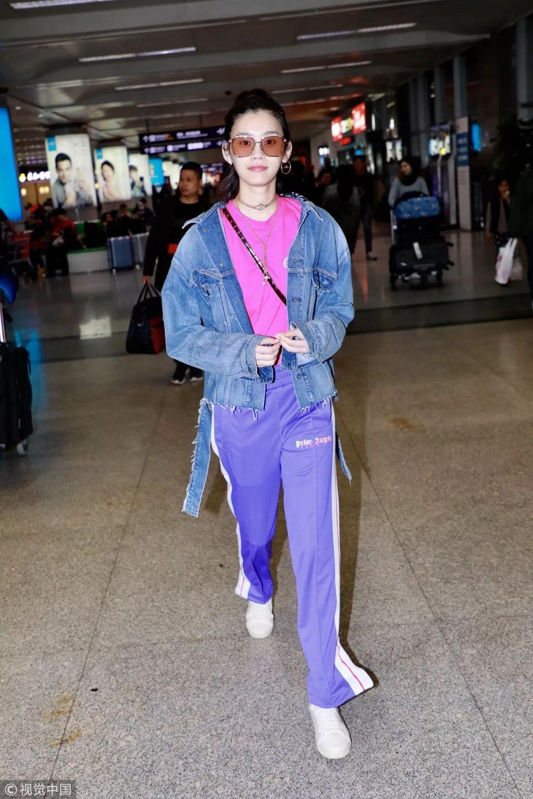 Balenciaga毛边牛仔夹克内搭玫红T恤,下搭Palm angels紫色带边运动裤,奚梦瑶这身瞬间从刚才的冬天入春。