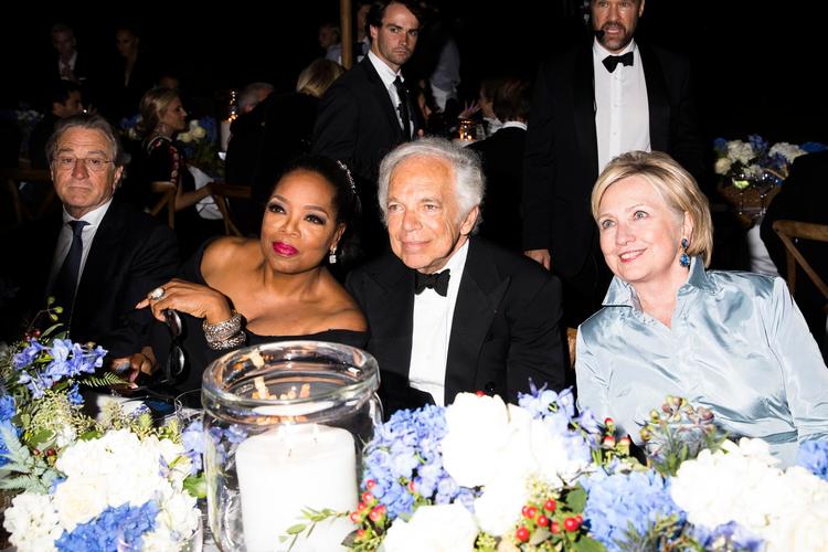 周年大秀邀请了 500 位嘉宾,这份包含时尚、媒体、零售、政界的名流清单很可能绝无仅有:希拉里·克林顿身穿淡蓝丝绸,两边有保镖守卫;第五任“邦德”皮尔斯·布鲁斯南和奥普拉坐在一块;罗伯特·德尼罗和斯皮尔伯格距离不远,还有安妮·海瑟薇、新订婚的尼克乔纳斯夫妇……所有美国时装屋的设计师可能都来了,Calvin Klein、Michael Kors、Donna Karan、Thom Browne,其中不乏老拉尔夫·劳伦当年的学徒,也有时装界的新人,比如说唱歌手 Kanye West。