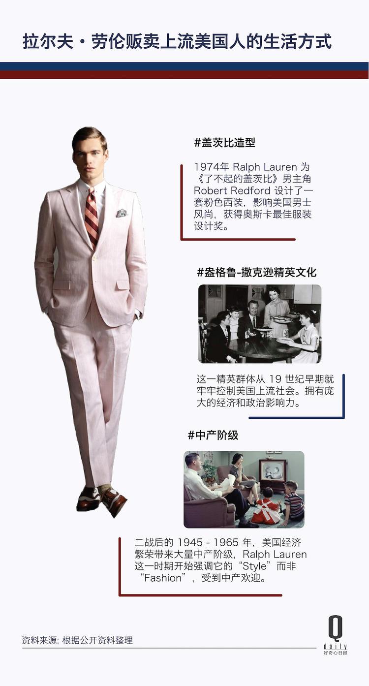 与大洋彼岸的欧洲同行们迥异的是,拉尔夫·劳伦用一套全新的美国式的价值观建立起自己跨越 80 个国家的服装帝国,他既能够展现贵族般的豪华,也能够做出粗犷实用的衣服。在半个世纪的服装和广告中,他引用了菲茨杰拉德笔下的盖茨比、华尔街银行家、落基山牧场主、西部牛仔等等远离大部分人生活的那群人的生活方式,然后把这套生活方式贩卖给不打马球的中产阶级。