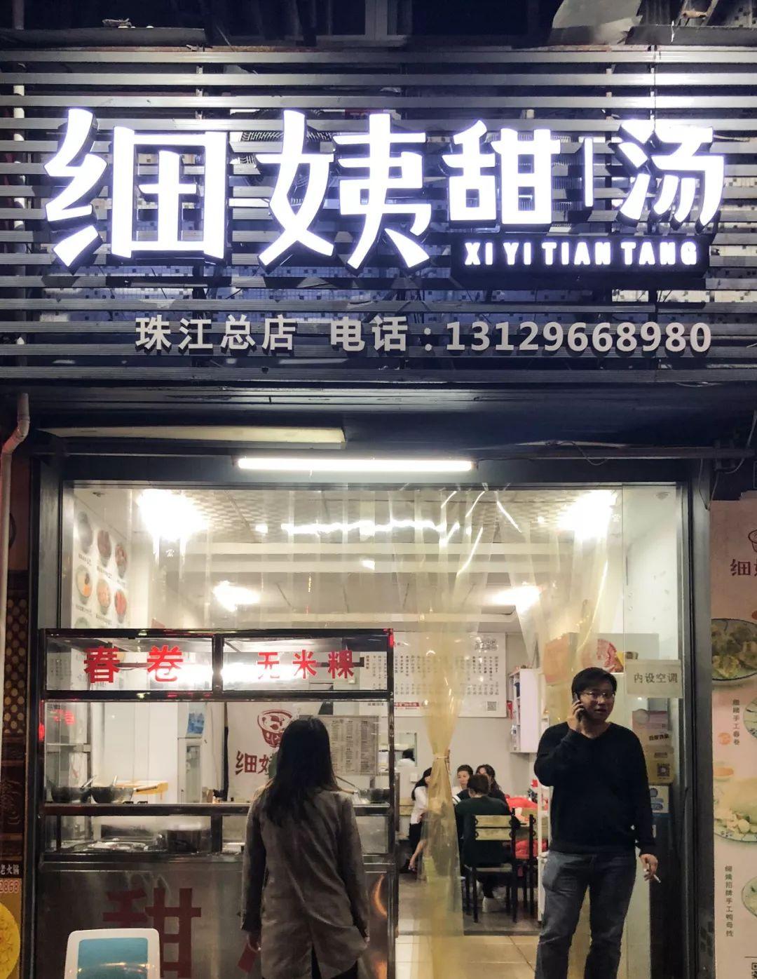 细姨甜汤一共有两家,两家共同点鲜明:一是都位于夜宵一条街上,周围不愁没有吃的;二是发挥都很稳定,堪称街上一枝花。