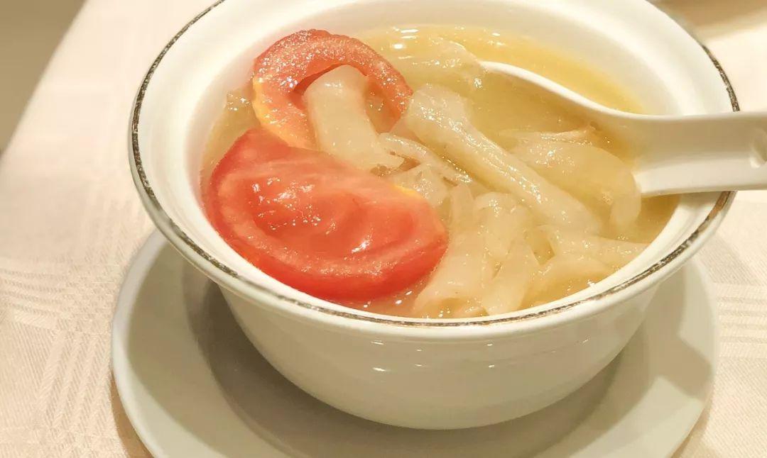在建业,花胶是重头戏。这里的焗花胶,汤汁绵密,花胶黏嘴,创新性地以柠檬、番茄入馔,清新可口,穿过你的舌尖喉头,暖到脚趾头。