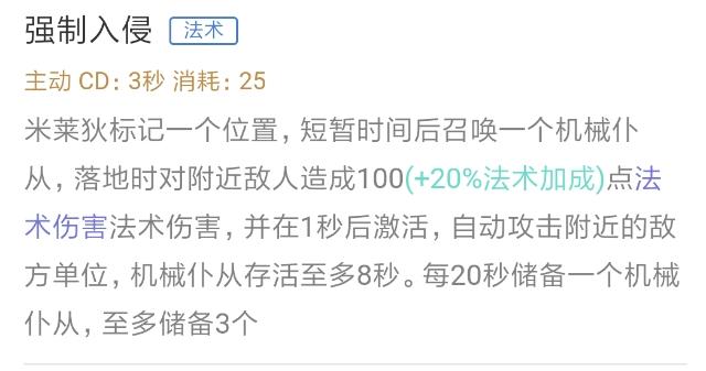 技能注意: 被动技能,直接被米莱狄或者机械仆从击杀的单位(除敌方机械仆从以外),会在其附近召唤1个机械仆从(至多存活8秒),短暂时间后冲向附近的敌人进行攻击。大招,直接击杀目标,能够获得3个机械小怪