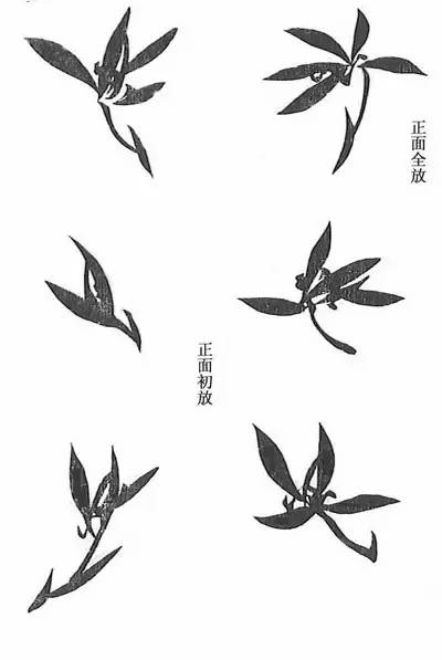 宓草氏曰:每种全图之*考前**证古人,添以己意。必先立诸法,次歌诀,次起手诸式者,便于循序求之,亦如学字之初,必先撇画省减以及繁多,自一笔、二笔至十数笔也。故起手式,花叶与枝,由少瓣以及多瓣,由小叶以及大叶,由单枝以及丛枝,各以类从。俾初学胸中眼底,如得永字八法,虽千百字,亦不外乎是。庶学者由浅说而深求之,则进乎技矣。