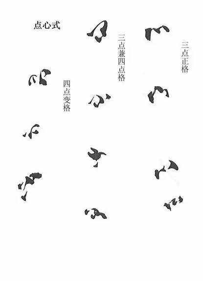 兰心三点如山字。或正或反,或仰或侧,惟相兰瓣所宜用之,此定格也。至三点有带为四点者,遇隔瓣及众花中恐蹈雷同,不妨破格。蕙花点心同此。↓↓↓