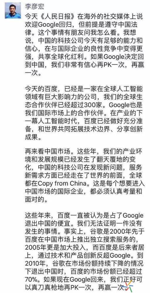 很快,李彦宏的声明也到了。在网上流传的这位百度掌门人最新的朋友圈里,有这样的文字:如果Google决定回到中国,我们非常有信心再PK一次,再赢一次。
