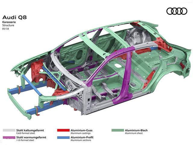 奥迪Q8车身采用全铝框架结构,包含多个轻量型铝制和热轧钢制部件。其中热轧钢部件占到了整个车身的14.4%,铸铝部件占到15%。