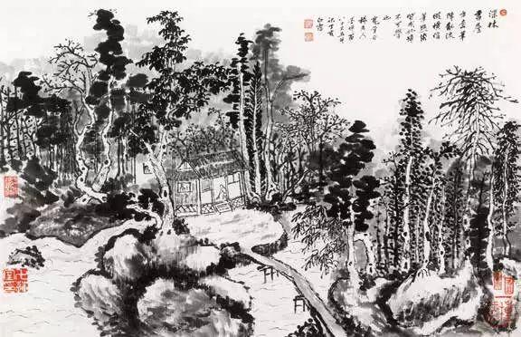 款识:深林书屋。方壶笔阵乱流纵横,信笔点染皆成妙谛,不可学也。宽堂、古梅老人、墨禅翁八十又五年并记。丁亥白露。
