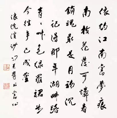 释文:依约江南旧梦痕,南枝花发可怜春。销魂最是月初沉。记得那年湖畔路,青青草色绿罗裙。如今往事已成尘。(浪)浣溪沙。冯其庸书旧作。