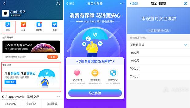 完成绑定后,进入支付宝「Apple 专区」专区,能够看到醒目的「安心保障」选项,点击进入设置页面,有 200、500、1000、1500 元、「不设置限额」共 5 档选项,大家可按需选择。