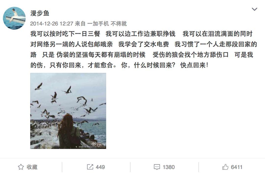 2014年12月,我能够按时吃下一日三餐,我能够边工作边兼职挣钱,我能够在泪流满面的同时对网络另一端的人说包邮哦亲,我学会了交水电费,我习惯了一个人走那段回家的路。只是伪装的坚强每天都有崩塌的时候,受伤的狼会找个地方舔伤口。可是我的伤,只有你回来,才能愈合。 你,什么时候回来? 快点回来!