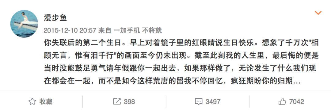 微博有一位叫“漫步鱼”的失联家属,她一直都没有放弃,一直在等待,这种耐心让人看了也是痛心。从2014年到现在,她未曾放弃,她的每一条微博都在等他,他到底什么时候才能回家...