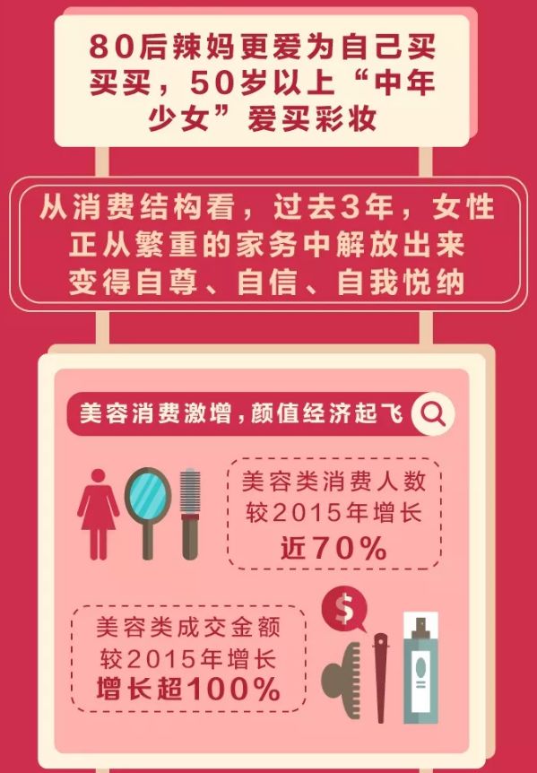根据国家统计局统计数据测算,我国25-45岁的女性占总人口的16%,约2.9亿人。《中国女性消费调查报告》也显示,中国城市女性就业比例近70%,独立经济来源为女性带来了更强消费力。