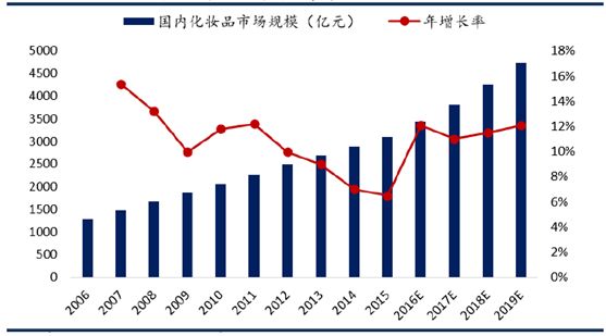 2017年化妆品零售总额同比增长13.5%增速5年来最高。