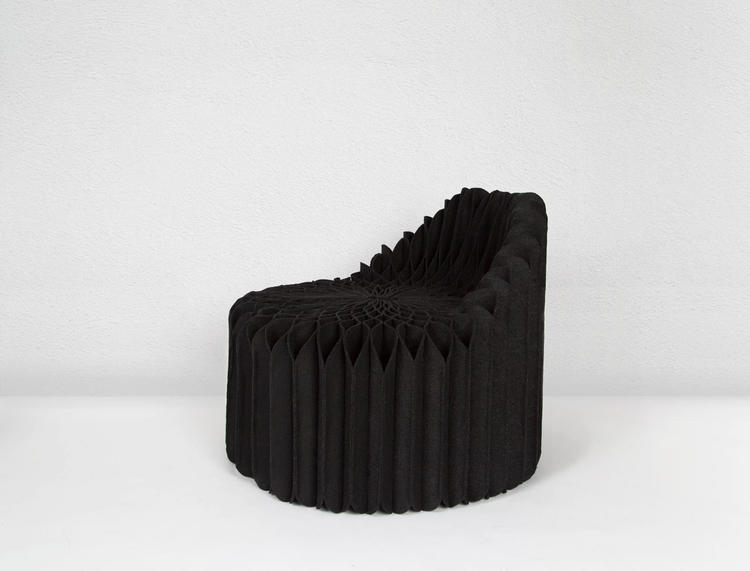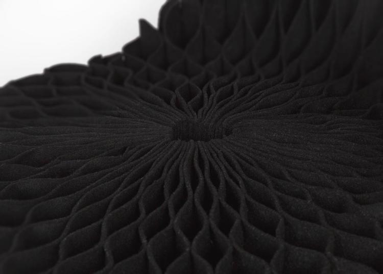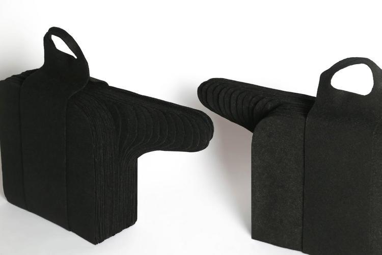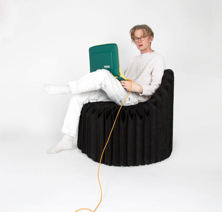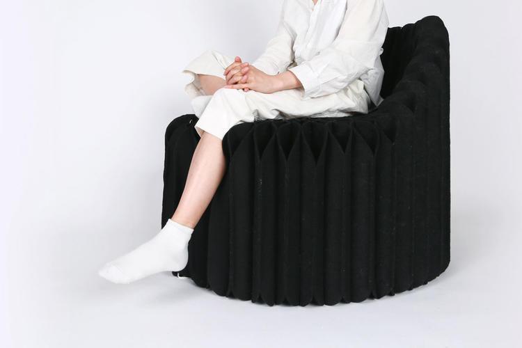 Möbel 椅出自设计师 Tianyi Shi 和 Max Hampton-Fischer 之手。它很轻,不足 9 公斤,由多层再生工业毛毡制成,这些毛毡固定在一起,在展开时形成蜂窝状图案。厚厚的毛毡层保证其结实耐用,满足一至两个人使用。椅子内有一个金属按扣,用于折叠椅子时使用。