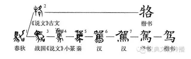 这是“驾轻就熟”的“驾”字,本为形声字。①是石鼓文的形体,其左为“马”,表形;其右为“加”,表声。②是小篆的写法,“加”移于“马”上,其义不变。③是楷书繁体字。④为简化字。《说文》:“驾,马在轭中。从马加声。”“驾”字的本义就是把车套在马身上,如《诗经·小雅·采薇》:“戎车既驾,四牡业业(强健的样子)。”