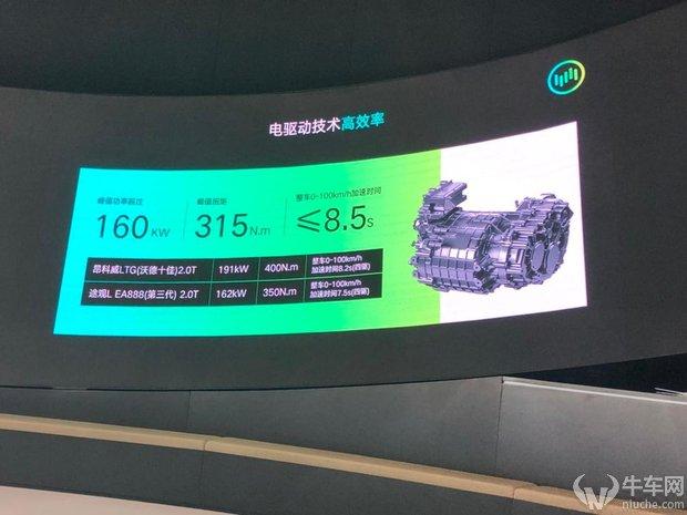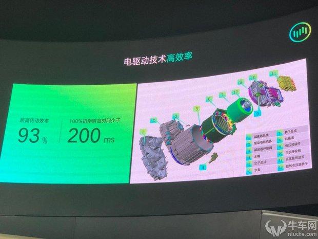 峰值功率超过160kW,峰值扭矩315N.m,整车0-100km/h加速时间小于等于8.5秒。100%扭矩响应时间少于200ms,动力系统传动效率高达93%,大幅优于传统燃油车40%,降低传动能耗,提升整车能量利用率。
