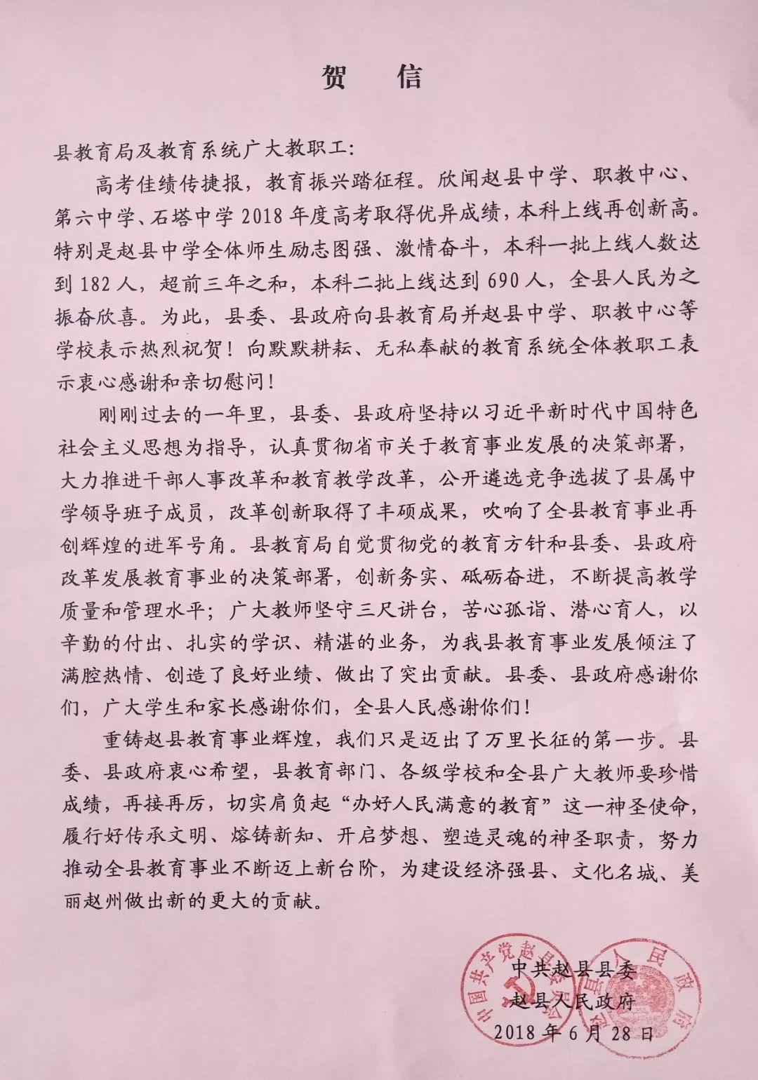 高考佳绩传捷报,教育振兴踏征程。欣闻赵县中学、职教中心、第六中学、石塔中学2018年度高考取得优异成绩,本科上线再创新高。特别是赵县中学全体师生励志图强、激情奋斗,本科一批上线人数达到182人,超前三年之和,本科二批上线达到690人,全县人民为之振奋欣喜。为此,县委、县政府向县教育局并赵县中学、职教中心等学校表示热烈祝贺!向默默耕耘、无私奉献的教育系统全体教职工表示衷心感谢和亲切慰问!