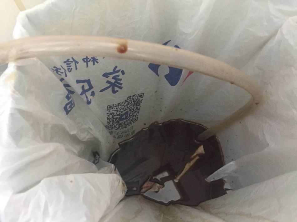 同时,蓝色布罩底部的孔,接上了一根管子,管子另一头直接放入垃圾袋里。从管子里流出黑色的油污。