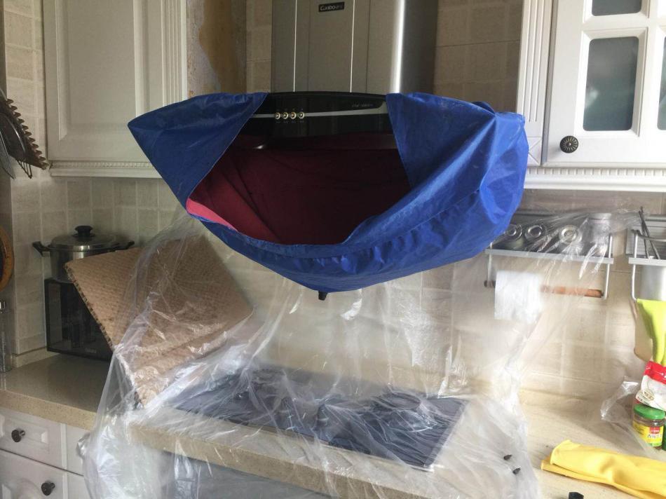 然后他又拿出一个蓝色布牢牢包住油烟机,蓝色布中间有个孔能够将滴下的油污排放掉。这里面黑呼呼的,工程师是怎么清洗的呢?我们拭目以待。