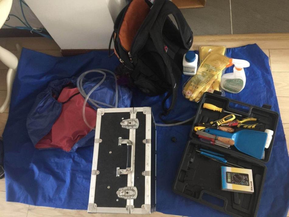 工程师带上橡胶手套,从满地的工具里拿出一个方方正正的工具箱,就是那个黑白相间,带锁的工具箱。打开来,里面有一个手持喷嘴,一根长长的透明管子,一个小小的能够吸水的机器。