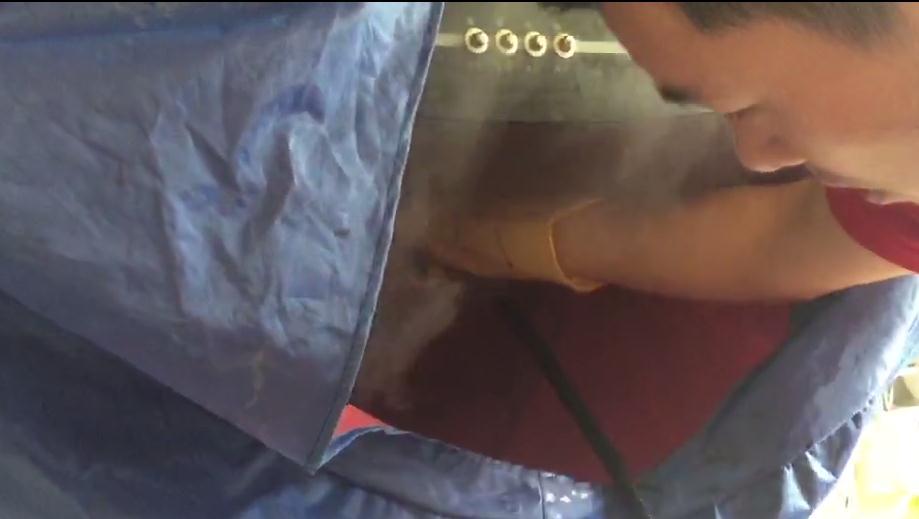 工程师把手持喷嘴伸进烟机内部,一阵阵白色的蒸汽飘了出来。